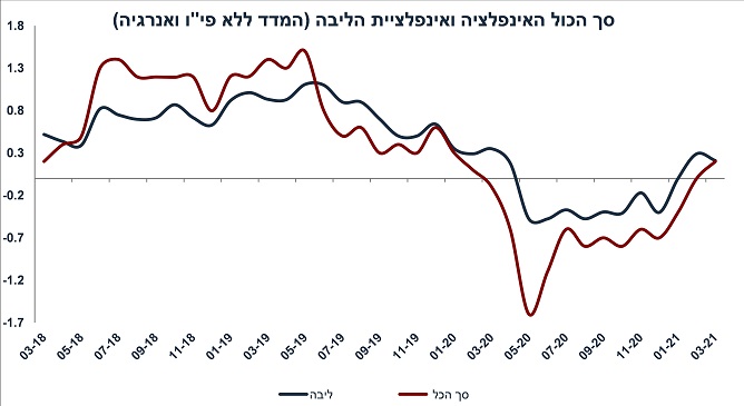 במרץ אינפלציית הליבה עלתה ב- 0.3% וב- 1.6% שנה אחרונה (הצפי היה ל-1.5%) עקב האצה בקצב עליית מחירי השירותים מול התמתנות במחירי הסחורות.