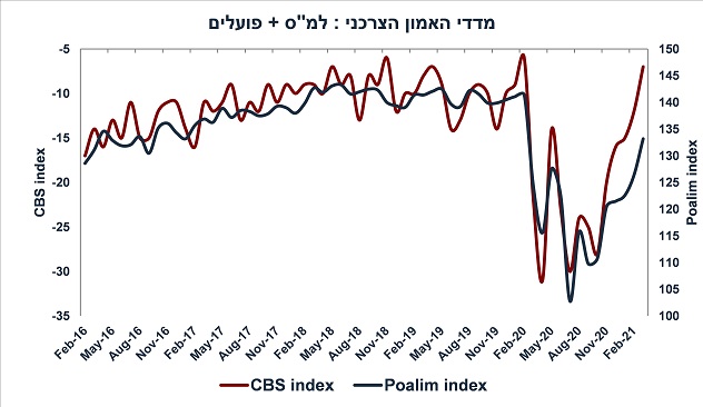שני מדדי מנהלי הרכש (פועלים והלמ"ס) מצביעים על עלייה חדה באמון הצרכני אל רמות של ערב משבר הקורונה (ראה גרף). השיפור באמון הצרכני נתמך על ידי פתיחה מהירה במגבלות, ירידה בתחלואה ואולי גם על ידי העלייה בשווקים הפיננסיים. רכיב המצב השוטף במדד של הפועלים עלה ב- 15.4 נקודות. במדד האמון של הלמ"ס מסתמנת עלייה באופטימיות לגבי מצב המדינה שנה קדימה. שיפור באופטימיות הצרכנית תומך בהתרחבות בצריכה הפרטית.