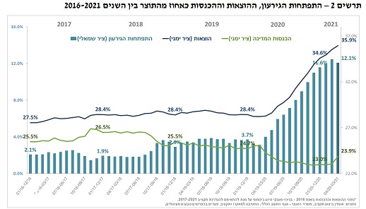 הגירעון התקציב הגיע ל- 11.4 מיליארד ₪ במרץ לעומת 15.9 מיליארד ₪ לפני שנה. הגירעון המצטבר ב- 12 החודשים האחרונים ירד ל- 12.1% תוצר מ- 12.4% לפני חודש. ההוצאות בגין משבר הקורונה הגיעו ל- 6.7 מיליארד ₪, לעומת 8-9 מיליארד ₪ בשיא המשבר ב- 2020. ההפתעה הגדולה באה מכיוון ההכנסות ממסים אשר זינקו ל- 30 מיליארד במרץ, גידול ריאלי של 23% לעומת מרץ 2020 (חודש בו ההכנסות היו נמוכות במיוחד). ההכנסות עלו ב- 15% ברבעון א' 21 לעומת רבעון א' 20 (ראה את הקו הירוק בגרף הבא). חל גידול גם במיסי הכנסה (כולל מס רווחי הון מסקטור ההיי טק) וגם במיסי צריכה.