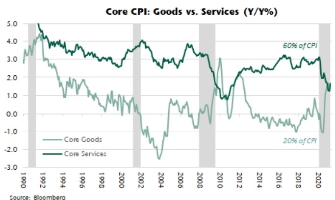 לעומת זאת, מחירי השירותים עלו ב- 0.4%, כנראה בהשפעת "הביקוש הכבוש" עם פתיחת מסעדות (עלייה של 3.7%) ומלונות (עלייה של 4.4%). התייקרו במיוחד שירותי בידור ושירותים רפואיים.