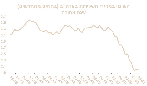 צפויה האצה בקצב עליית מחירי השכירות על רקע ירידה במלאי הדירות הפנוי, התאוששות מהירה בתעסוקה, ובפרט בענפי ההיי טק עבור צעירים אשר שואפים לשכור במרכז. אנו צופים האצה גם ב- 2022 על רקע החזרה של התיירות מחו"ל (Airbnb). אנו מניחים עלייה של 1.8% בסעיף הדיור שנה קדימה. יחד עם זאת, כניסה של משקיעים לשוק הרכישות מגדילה את מלאי הדירות לשכירות.