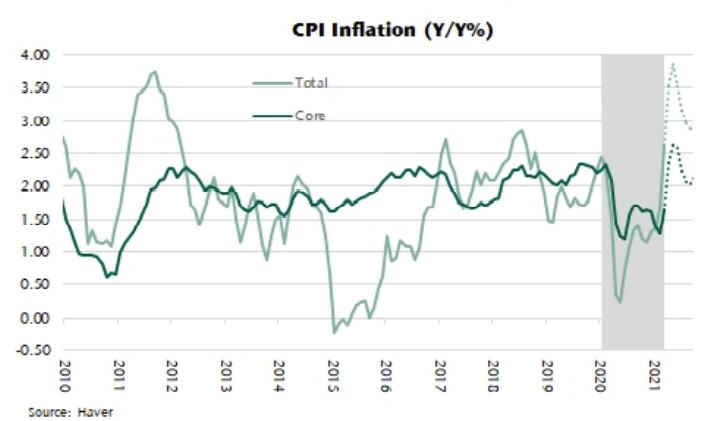 קיימת ציפייה להמשך האצה באינפלציית הליבה בחודשים הקרובים לקצב של 2.6% בחודש מאי (וסך הכול האינפלציה ל- 3.8%). מדובר בהשפעת ה- base effect, ההשוואה מול מדדים מאד נמוכים (שליליים) בחודשים אפריל-מאי 2020 בשיא משבר הקורונה. יחד עם זאת, קצב האינפלציה השנתי צפוי להתמתן בחזרה בחודשים יולי-אוגוסט (תחזית בית השקעות Jefferies).